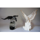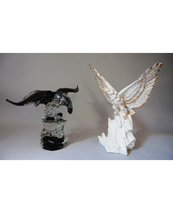 Lotto di due aquile su roccia, una in vetro trasparente e nero di Murano ed una in ceramica bianca con decori in oro. Alt. cm30/42