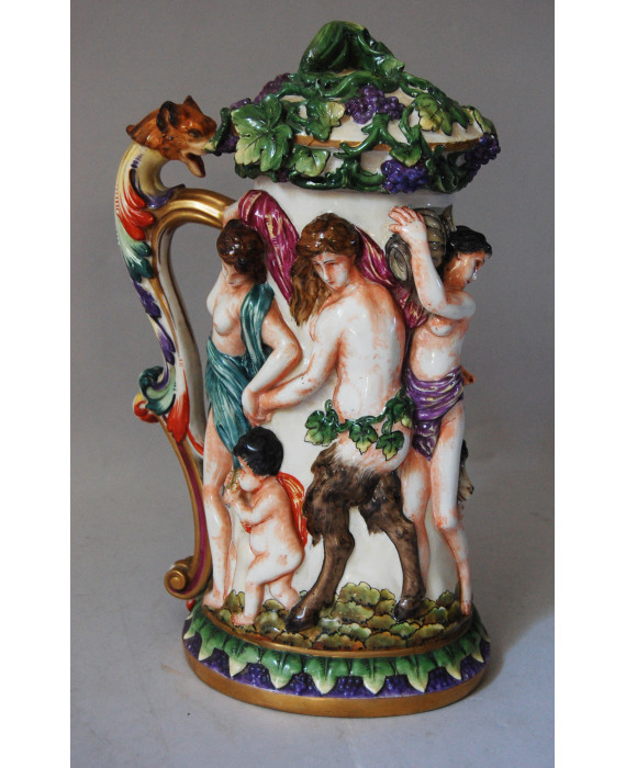 Grande boccale con coperchio in porcellana di Capodimonte lavorato a bassorilievo con trionfo di Bacco, satiri e menadi danzanti, manico a doppia voluta terminante a testa di leopardo. coperchio decorato con tralci d’uva. Inizi sec. XX. Alt. cm33 (restauri al coperchio)
