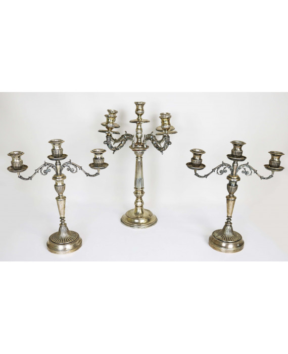 Lotto di un candelabro a cinque fiamme ed una coppia di candelabri a tre fiamme, in argento 800. Alt. cm43/33(2). Peso tot. gr. 1800 (ammaccature alla base del candelabro a cinque fiamme)