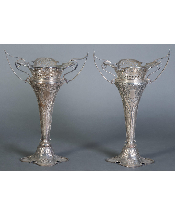 Coppia di eleganti vasi biansati con bordo superiore traforato a volute vegetali, fusto e base lavorate con foglie lanceolate e serti floreali. Bolli Sheffield 1908-1909, argentiere Walker & Hall. Alt. cm33. Peso tot. gr. 1020