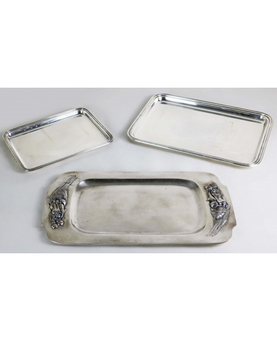 Lotto di tre vassoi in argento 800, di cui uno con prese lavorate a sbalzo con ortaggi. Peso tot. gr. 2660