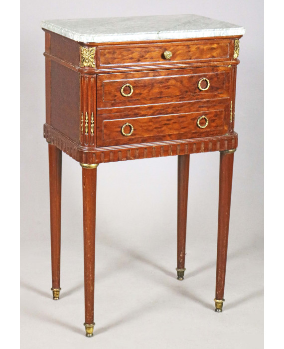 Mobiletto impiallacciato in legno di mogano, un cassetto, uno sportello, applicazioni in bronzo piano in marmo. cm84x49x33 (restauri al marmo)