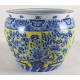 Cachepot in porcellana dipinto nei toni del blu e del giallo con vasi fioriti. Alt. cm35; diam. cm42