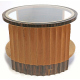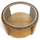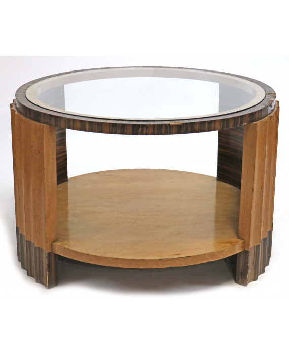 Tavolo da salotto con base tonda a profilo costolato, impiallacciata in legno di palissandro e betulla, piano in vetro. Italia, periodo Decò. Alt. cm 54; diam. cm 80 (mancanze)