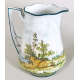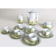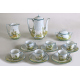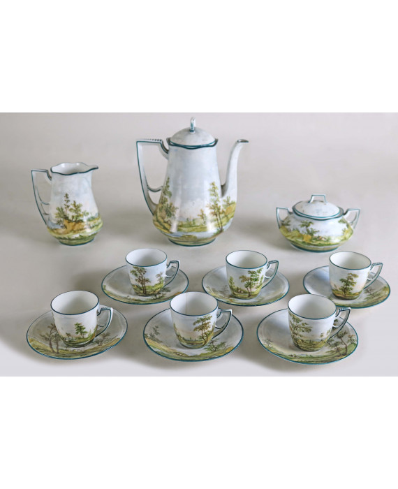 Servizio da caffè in porcellana dipinta con paesaggi fluviali con alberi e caseggiati, composto da caffettiera, lattiera, zuccheriera e sei tazzine con piattino. Probabile manifattura di San Marino degli inizi del sec. XX (restauro e filatura a due tazzine)