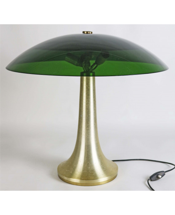 Lampada da tavolo con base in metallo e paralume in plexiglass a fondo verde. Design degli anni '70/'80. Alt. cm45 (usure del tempo)