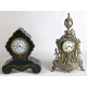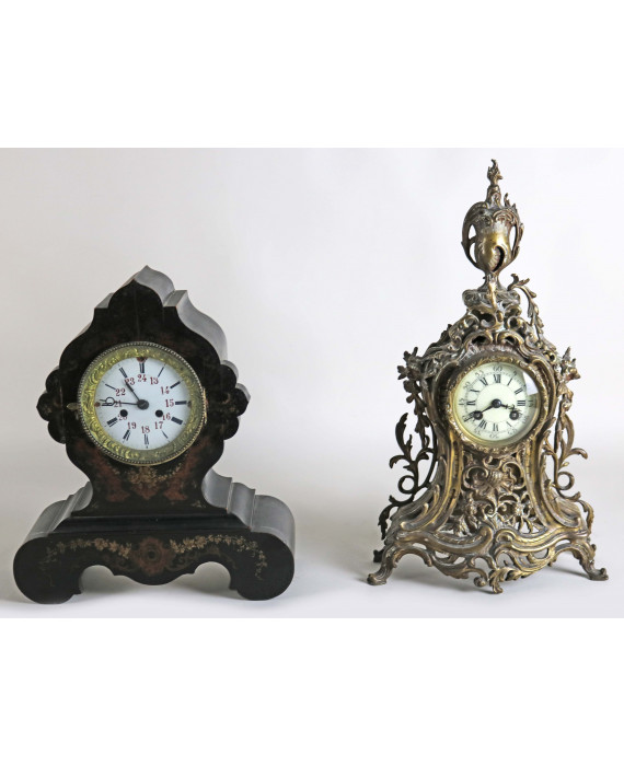 Lotto di due orologi da tavolo: uno in legno decorato con serti vegetali ed uno in bronzo dorato lavorato a volute. Italia, sec. XIX. cm35x30x12; cm46x26x12 (difetti e da revisionare)