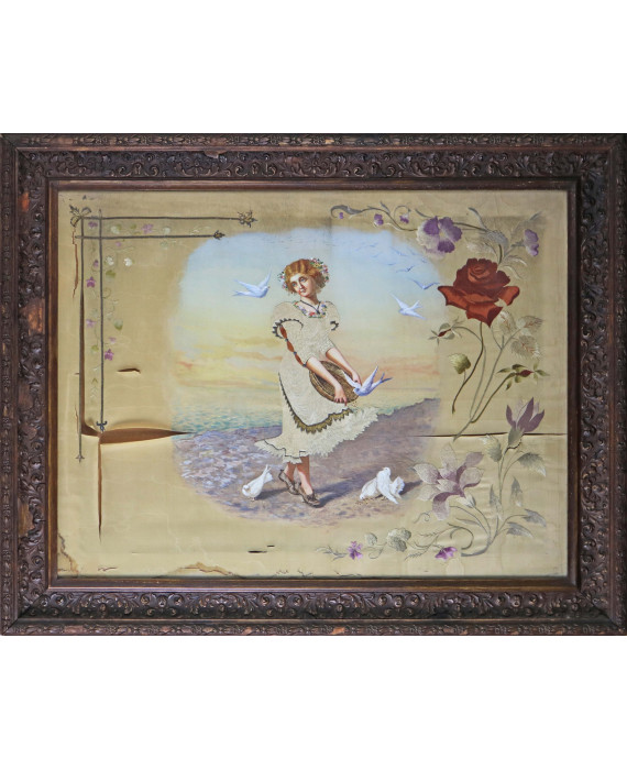 Artista del sec. XX. Tessuto in seta dipinto e ricamato raffigurante gentildonna con colombe, con cornice