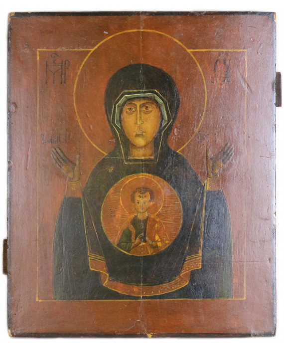 Icona dipinta su tavola raffigurante la Madonna del Segno. Russia, inizi sec. XIX. cm31x26 (piccole mancanze alla pittura)