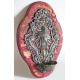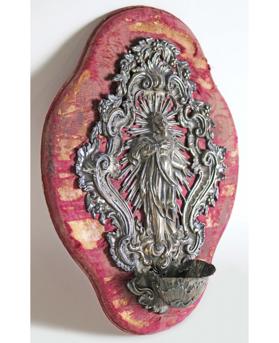 Acquasantiera in argento lavorato a sbalzo con volute rocaille e serti floreali, centrale con Immacolata Concezione e raggiera, vaschetta inferiore, montata su pannello rivestito in tessuto. Bolli non identificati con data 1773. Probabile manifattura parigina, seconda metà del sec. XVIII. cm30x23. Peso gr. 180 (difetti alla vaschetta)
