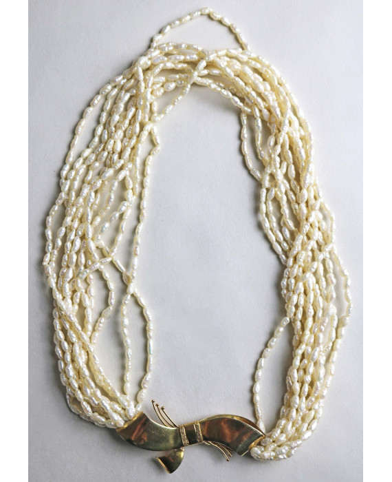 Collana in perle d'acqua dolce con chiusura a fiocco in oro giallo 18Kt. Peso tot. gr. 78. Allegata dichiarazione di autenticità a cura della gioielleria Ci&Ci