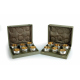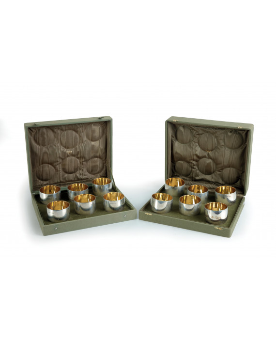 Set di dodici bicchieri in argento 925 con interni in vermeille, di marca Bulgari, datati 1973, in due custodie originali. Peso tot. gr. 2300