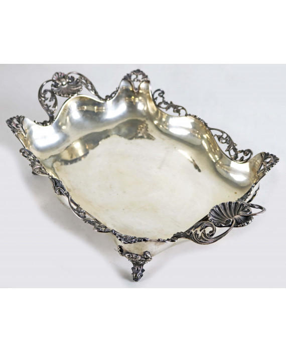Elegante centrotavola in argento 800 lavorato con motivi vegetali, anse a conchiglia, peducci a voluta terminanti a testa di delfino. Peso gr. 1645