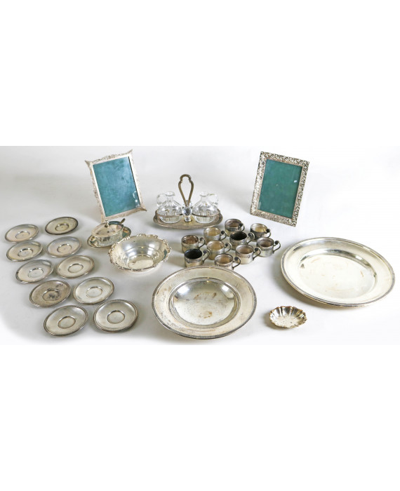 Lotto di numerosi oggetti in argento 800: un'oliera con ampolle in vetro, due cornici da tavolo, quattro centrotavola, una formaggiera con vaschetta in vetro e dieci porta-tazzine con piattino. Peso tot. dell'argento gr. 1840