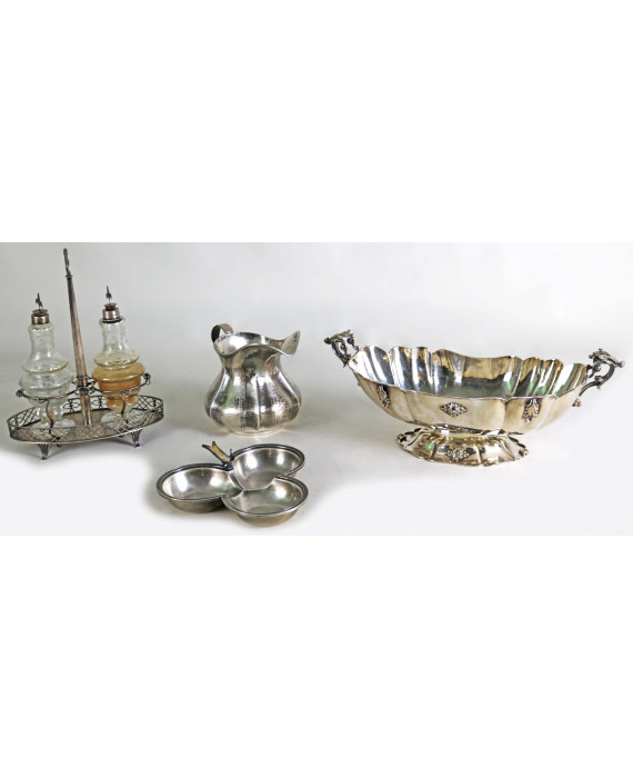 Lotto di quattro oggetti in argento: una antipastiera in argento 925, una caraffa ed un centrotavola in argento 800 ed una oliera in argento non bollato. Peso tot. gr. 2150