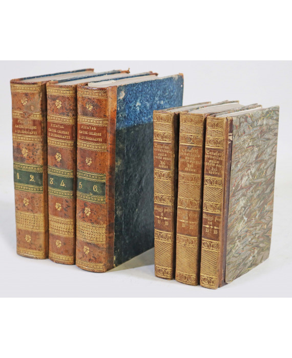 Lotto di sei volumi: Francois Gayot de Pitaval. Cause celebri e interessanti co' giudizi che l'hanno decise. Napoli. Presso Vincenzo Pauria. 1755. Opera in sei tomi raccolti in tre volumi con legatura in mezza pelle; Francesco Canofari. Comentario sulla parte seconda del Codice per lo Regno delle Due Sicilie. Napoli. Dalla Tipografia di Angelo Trani. 1819. Opera in tre volumi con legatura in mezza pelle.