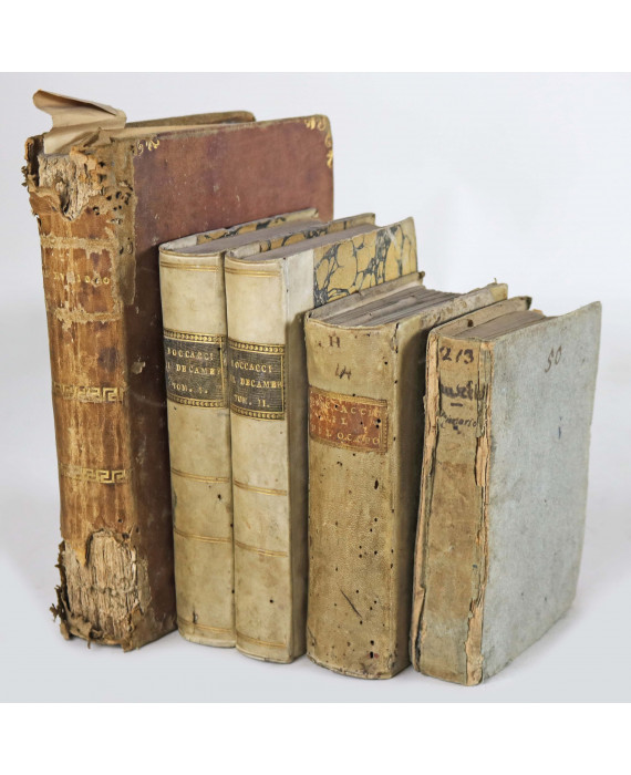 Lotto di cinque volumi: Giovanni Boccaccio. Il filocopo. Venezia. Appresso Giovan Antonio Bertano. 1575. Volume con legatura in mezza pergamena (difetti); Giovanni Boccaccio. Del Decamerone. Amsterdam. 1718. Opera in due volume con legatura in mezza pergamena (difetti e bruniture); Girolamo Ruscelli. Il rimario. Venezia. Appresso Antonio Tivani. 1698. Volume con legatura in cartonato (difetti); Ludovico Ariosto. Orlando furioso. Venezia. Appresso Gabriel Giolito de Ferrari. 1548 (difetti)
