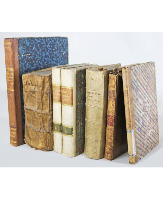 Lotto di sette volumi: Francesco Maria Fiorentini. Hetruscae pietatis origines sive De prima Thusciae christianitate. Lucca. Typis Dominici Ciuffetti. 1701. Volume con legatura in mezza pelle; Cosimo della Rena. Storia de' duchi e marchesi che hanno governato la Toscana dall'anno MCXXXIX fino all'anno MCLXX. In Augusta. s.d. Volume con legatura in mezza pelle; Giovanni Prezziner. Storia del pubblico studio e delle società scientifiche e letterarie di Firenze. Firenze. Appresso Carli in Borgo SS. Apostoli. 1810. Volume con legatura in pelle; Luca Giuseppe Cerracchini. Fasti teologali ovvero notizie storiche del collegio de' teologi della sacra università fiorentina. Firenze. Per Francesco Moucke Stampatore Arcivescovale. 1738. Volume con legatura in pergamena; Celio Malespini. Ducento novelle. Venezia. Al segno dell'Italia. 1609. Volume con legatura in pergamena (difetti); Enrico Valtancoli Montazio. Annali di Pisa dalla sua origine fino all'anno 1840. Lucca. Tipografia di Luigi Guidotti. 1842. Opera in due volumi con legatura in mezza pelle.
