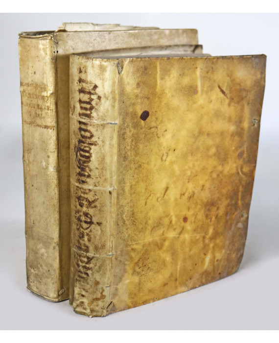Lotto di due volumi con legatura in pergamena: Francesco Sansovino. Origine e fatti delle famiglie illustri d'Italia. Venezia. Presso Combi, & La Noù. 1670; Francesco Sansovino. Cronologia del mondo. Venezia. Nella Stamperia della Luna. 1580 (lievi difetti)