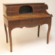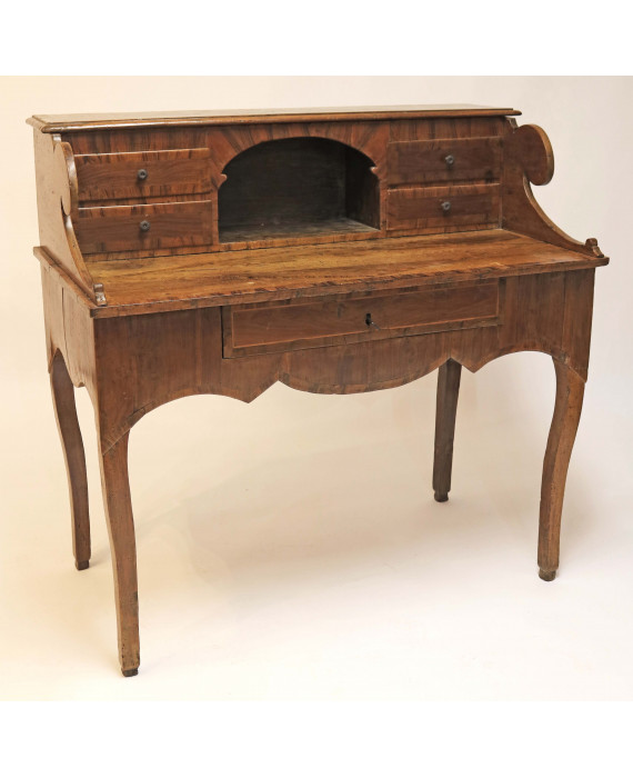 Scrivania con alzata in legno di ciliegio, parte superiore con quattro cassettini e vano a giorno centrale, un cassetto inferiore, gambe mosse. Italia, sec. XVIII. cm113x117x63 (lievi difetti e piccole mancanze)