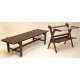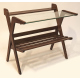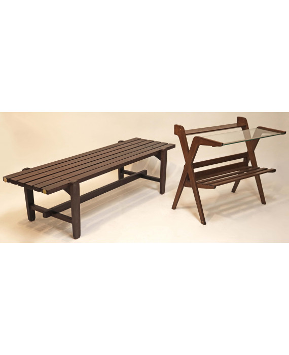 Lpotto di una panca a tre posti in legno tinto noce ed un portariviste in legno do castagno con piano in vetro degli anni '50. cm38x140x46; cm64x67x45
