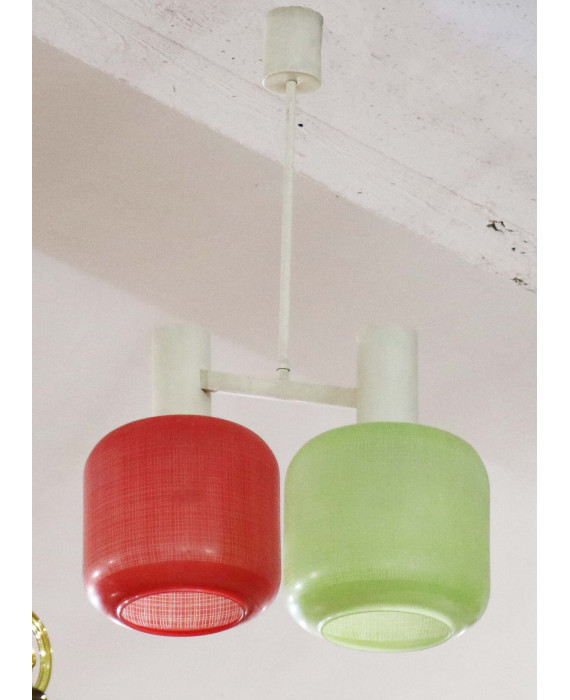 Lampadario a due luci con struttura in metallo verniciato bianco e due bobeches in vetro rosso e verde. Design degli anni '70/'80. Alt. cm68 (usure del tempo)