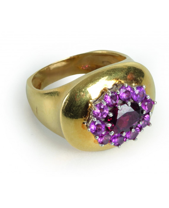 Anello in oro giallo 18Kt con ametiste taglio ovale e fondo di circa 2 carati. Peso gr. 9,7. Misura 16. Allegata dichiarazione di autenticità a cura della gioielleria Ci&Ci