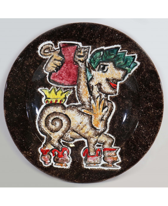 Piatto da parata in maiolica raffigurante figura zoomorfa, sul retro iscrizioni incise. diam. cm53