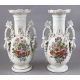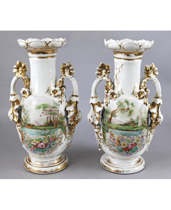 Coppia di vasi biansati in porcellana a fondo bianco decorata in oro e dipinta con fiori. Francia, sec. XIX. Alt. cm50. (mancanze alla doratura)