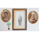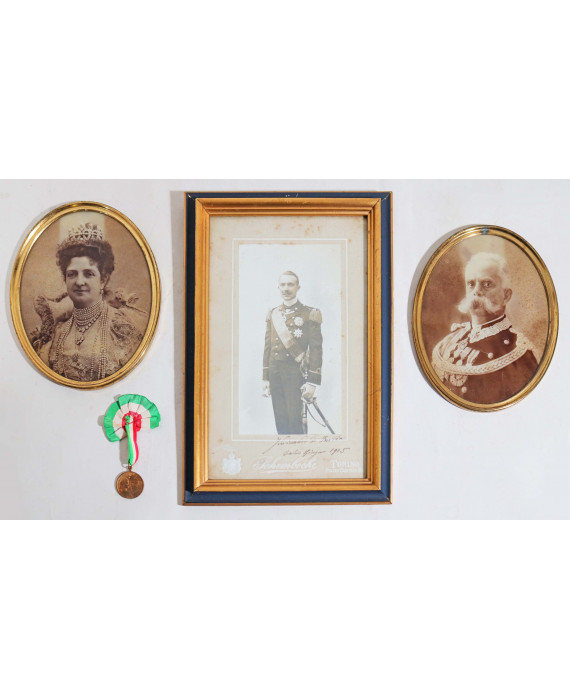 Lotto di una foto autografa di Ferdinando di Savoia, datata 1905, una coppia di foto ovali in cornici in ottone ritraenti Umberto I di Savoia e la regina Margherita ed una medaglia ricordo alle auguste nozze di Vittorio Emanuele di savoia e la regina Elena. cm27x16; cm17x13 (2)