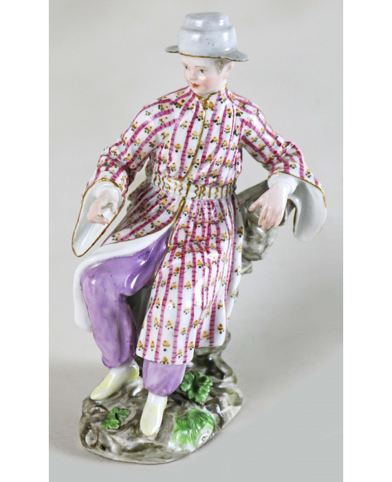 Statuina in porcellana dipinta raffigurante giovane seduto in abiti orientali. Probabile manifattura tedesca del sec. XIX. Alt. cm13 (piccola mancanza)