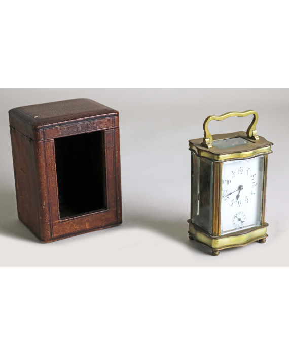Orologio cappuccina in metallo dorato, completo di custodia. Francia, sec. XIX. Alt. cm12 (da revisionare e usure alla custodia)