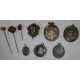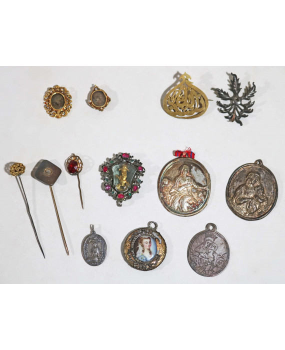 Lotto di tre ciondoli a reliquiario del sec. XVIII, di cui due in oro 18kt ed uno in argento e pietre, tre medaglie sacre in argento, tre spilloni ed un ciondolo tondo con smalto. Peso lordo dei due reliquari in oro gr. 8.5 (difetti)