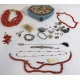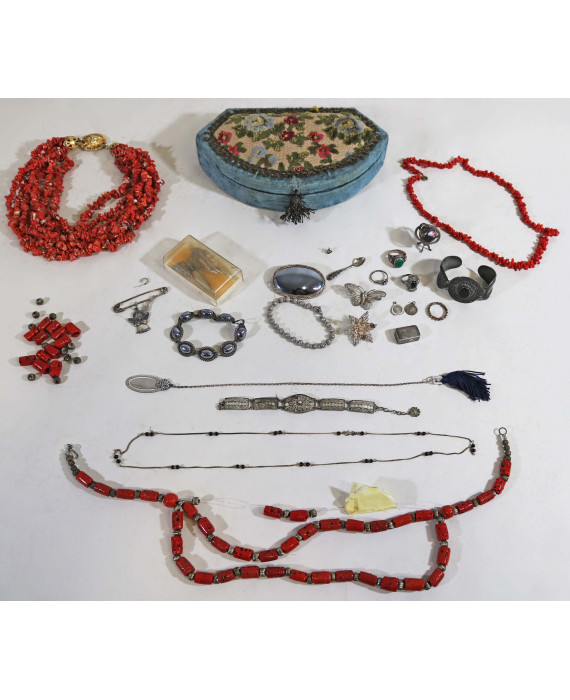 Lotto di varia bigiotteria in argento e tre collane in radice di corallo. Peso rilevabile dell'argento gr. 140