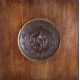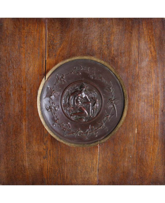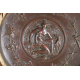 Piatto in rame sbalzato della fine del sec. XIX con Diana cacciatrice e tralci di quercia con insetti, con cornice in legno di rovere. Diam. cm20