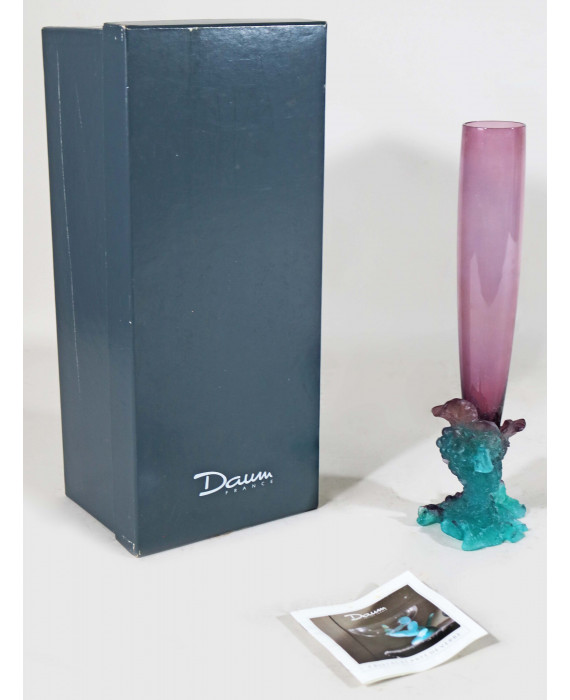 Vaso Daum modello Bacchus in vetro e pasta vitrea a fondo ametista. Alt. cm. 33