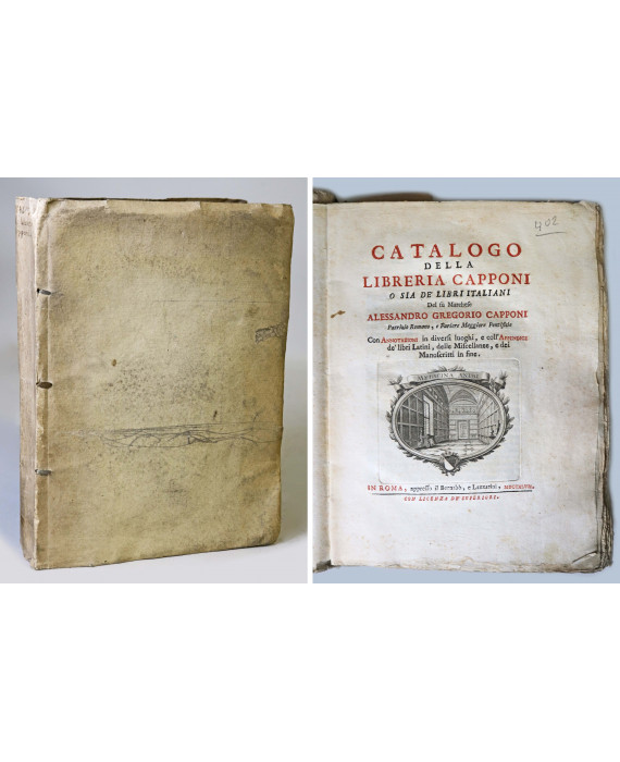 Catalogo della libreria Capponi o sia de' libri italiani del fù marchese Alessandro Gregorio Capponi. Roma, appresso il Bernabò e Lazzarini. 1747. Volume con legatura in cartonato.