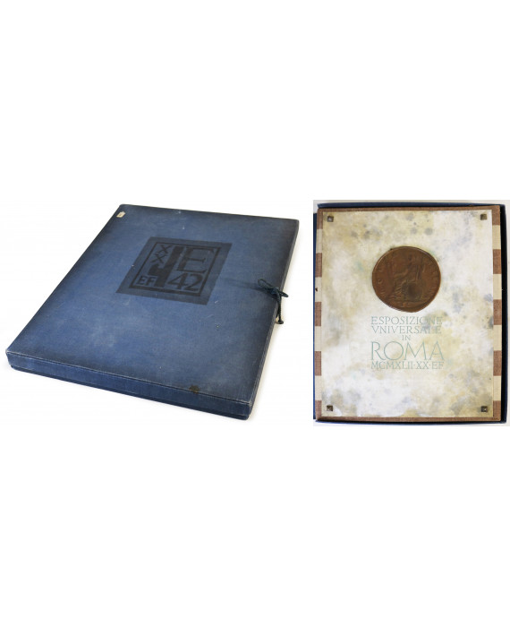 Esposizione universale in Roma - MCMXLII - XX - EF. Volume di grande formato con legatura in cartonato rivestito in tela, sul piatto anteriore tondo in rame sbalzato, custodia in cartonato rivestito in tela blu. Probabile bozza progettuale con di illustrazioni ritoccate a mano e alcune parti incomplete. Priva editore, luogo e anno di edizione