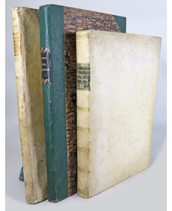 Lotto di tre volumi: Camillo Peregrino. Historia principum langobardorum. Leida. Sumptibus Petri Vander Aa. (1725). Volume con legatura in cartonato; Pietro De Vinea. Constitutiones regum rgeni utriusque Siciliae. Napoli. Ex regia Typographia. 1786. Volume con legatura in pergamena; Trojano Spinelli duca d'Aquaro. Saggio di tavola cronologica de' principi e più raguardevoli ufficiale che anno signoreggiato, e retto le provincie, che ora compongono il Regno di Napoli. Napoli. Nella stamperia di Giuseppe di Bisogni. 1762. Volume con coperta in pergamena (carta brunita, restauri, fori di tarlo)