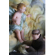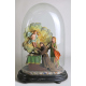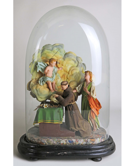 Gruppo in cera dipinta raffigurante Sant'Antonio da Padova con angelo e Gesù Bambino, entro campana in vetro con base in legno. Manifattura siciliana, sec. XIX. cm31x25x12 (rotture e mancanze)