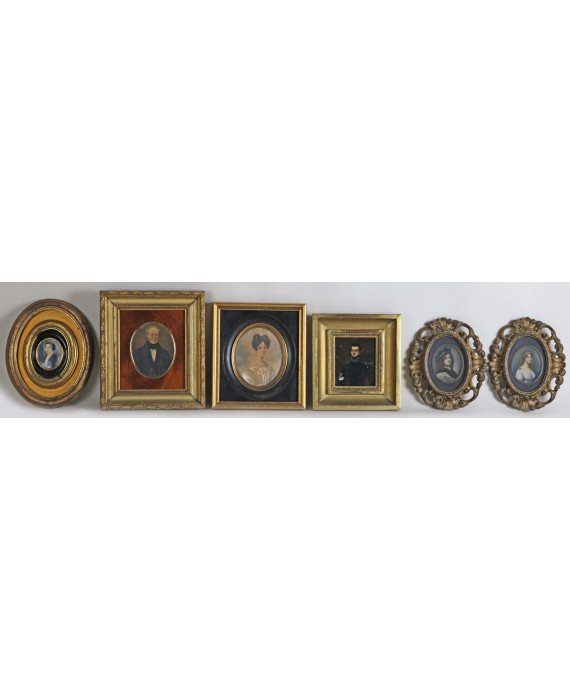 Lotto di sei miniature raffiguranti gentiluomini e gentildonne, con cornici. cm12x9/6,5x5,5/13x10/10x9/8,5x6,5(2)