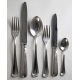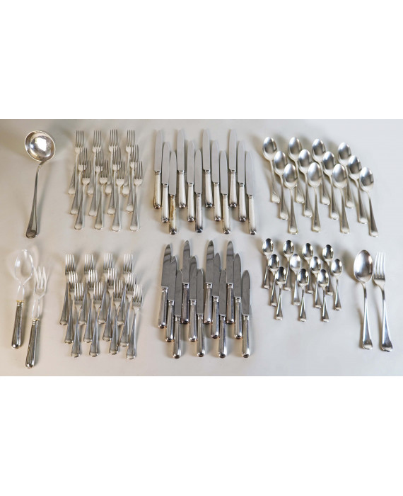Servizio di posate in argento 800 composto da 12 forchette, 12 cucchiai, 12 coltelli, 12 forchette e 12 coltelli medi, 11 cucchiaini e quattro posate di servizio. Peso totale escluso i coltelli ed una posata di servizio gr. 3400
