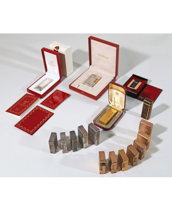 Lotto di 17 accendini: uno di marca Dunhill in metallo dorato con custodia, un Dupont Gatsby con scatola originale, un Cartier modello Trinity in lacca marrone, un Dupont in laque de Chine e metallo dorato con custodia, un Cartier placcato in argento con garanzia, libretto e custodia originali e 12 Dupont, di cui 5 in metallo argentato e 7 in metallo dorato (difetti)