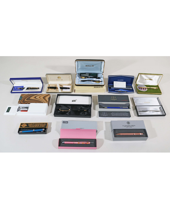 Lotto di tredicii penne da collezione tra cui una penna micromina di marca Mont Blanc, due Parker, una Waterman, una Aurora e due Pelikan.