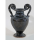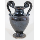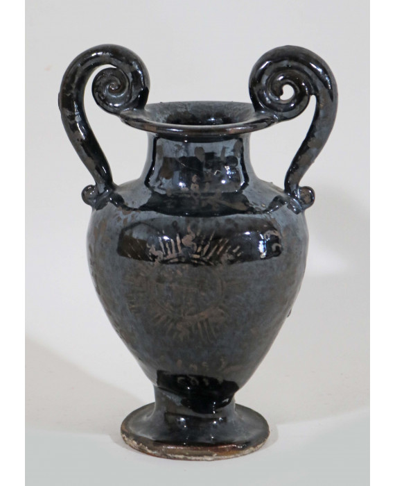 Piccola vaso biansato in maiolica a fondo nero dipinta in oro con monogramma cristologico, entro raggiera e riserve vegetali. Anghiari, sec. XVIII. Alt. cm21