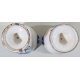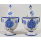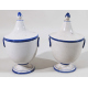 Coppia di vasi da farmacia in ceramica a fondo bianco decorata in blu con fiori e stemma araldico coronato ed iscrizioni Ung. Mercurial e Conf di Ginepro. Italia centrale, sec. XIX. Alt. cm28 (restauri ad un coperchio e craquele diffuso)