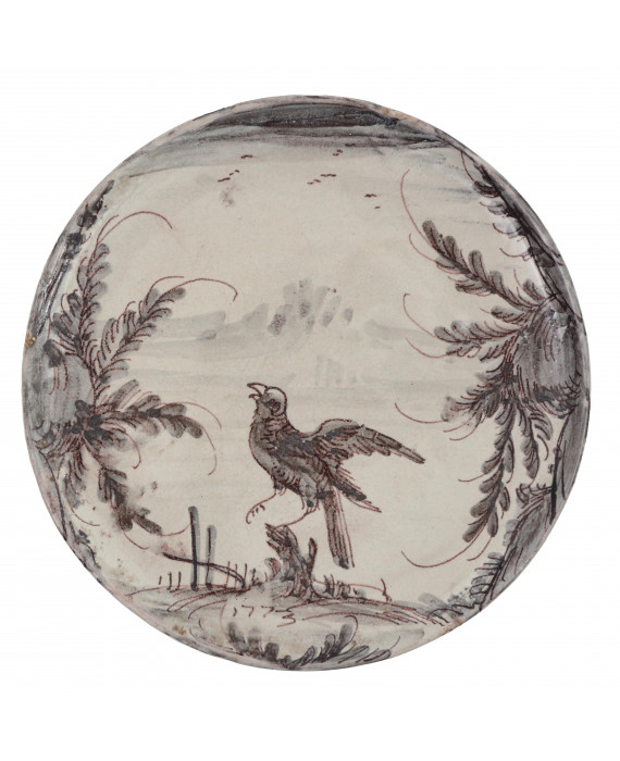 Alzatina in maiolica dipinta in monocromia con corvo e alberi. Savona, fine sec. XVII. alt. cm6, Diam. cm22
