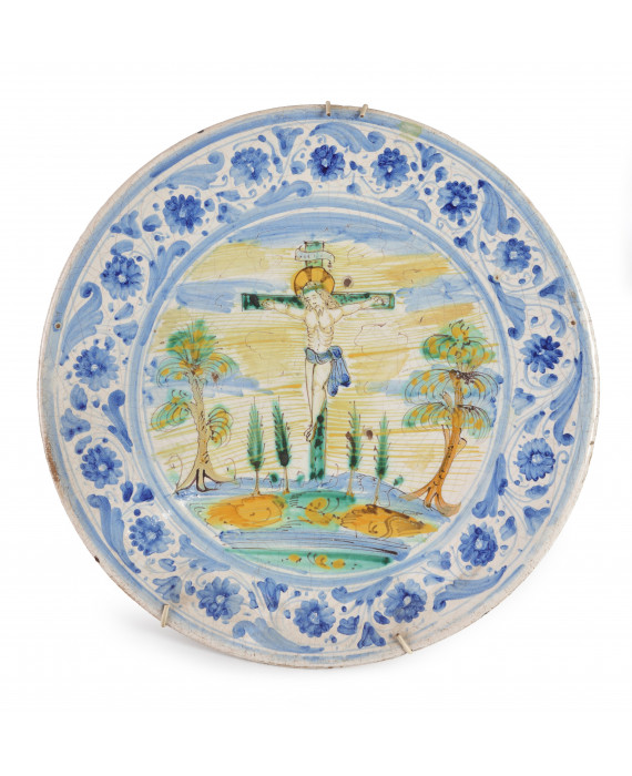 Piatto da parata in maiolica con tesa dipinta a serti floreali e centrale con crocefissione. Deruta, sec. XVII/XVIII. Diam. cm35