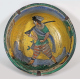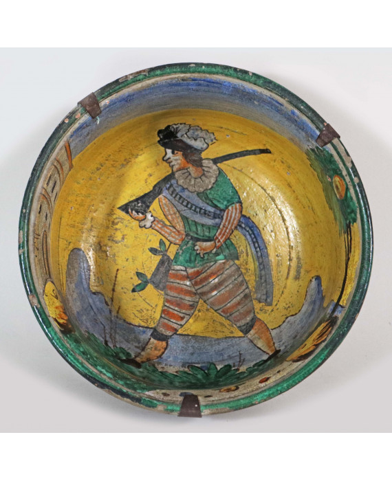 Conca in maiolica dipinta con paesaggio, ruderi e cacciatore. Montelupo, sec. XVIII/XIX. Alt. cm13; diam. cm23 (lievi scheggiature)