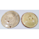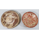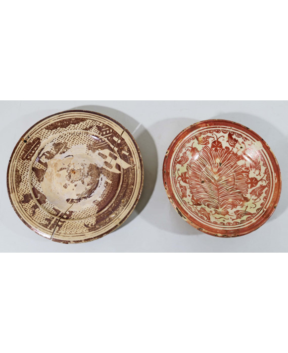Lotto di un bacile smaltato bianco dipinto a lustro rosso con larga foglia centrale e piccoli garofani alle estremità, produzione di Manises del sec. XVIII ed un piatto con bugnatura centrale in smalto avorio dipinto a lustro color ruggine con caseggiati, produzione di Manises del sec. XVII. Diam. cm30 ( bacile restaurato con abrasioni al bordo); diam. cm35 (piatto da restaurare con ampie mancanze agli smalti e alla pittura)